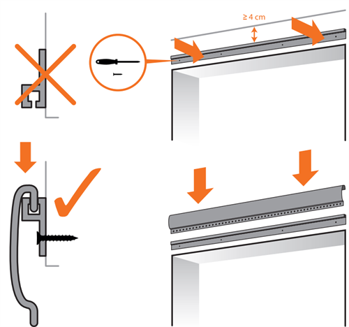 Befestigen Sie das h-Profil so, dass die Kerbe nach oben zeigt. Der Schenkel des "h" zeigt nach unten. Achten Sie darauf, dass Sie 4 cm Platz haben, den Sie für die gesamte Montage des H-Profils mit breitem Streifen benötigen. Sonst können Sie den Vorhang nicht richtig einhängen.