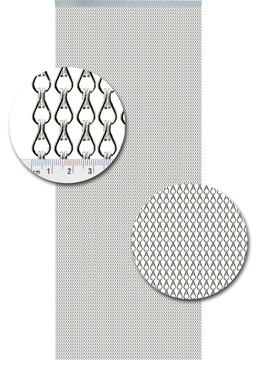 Silber ist ein großes Glied. Ein Meter besteht aus 78 Streifen normaler Glieder. Die Größe dieses Glieds ist 24 mm lang und 12 mm breit. Die Fliegenvorhänge aus Aluminium haben eine gute Lichtdurchlässigkeit. Die Glieder bestehen aus eloxiertem Draht und sind farbecht. Sie können eine breite oder schmale Aufhängeleiste wählen. Kurzum, diese Vorhänge sind sehr stark!