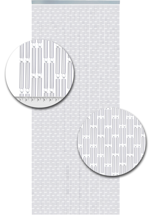 Neben diesem gestaffelten Modell können Sie auch einen geraden transparenten Fliegenvorhang wählen.